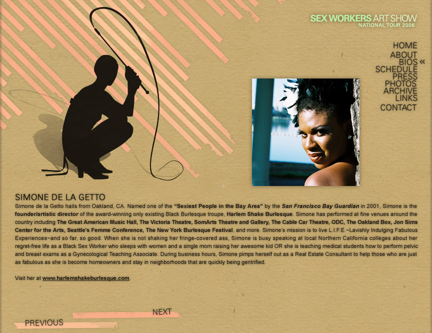 Links Back to Artist and Performers Biographies Sex Workers Art Show 2006 Tour Schedule About Sex Workers Art Show Home Press Contact Information Tour Archive Photographs Scarlot Harlot Michelle Tea Launch site